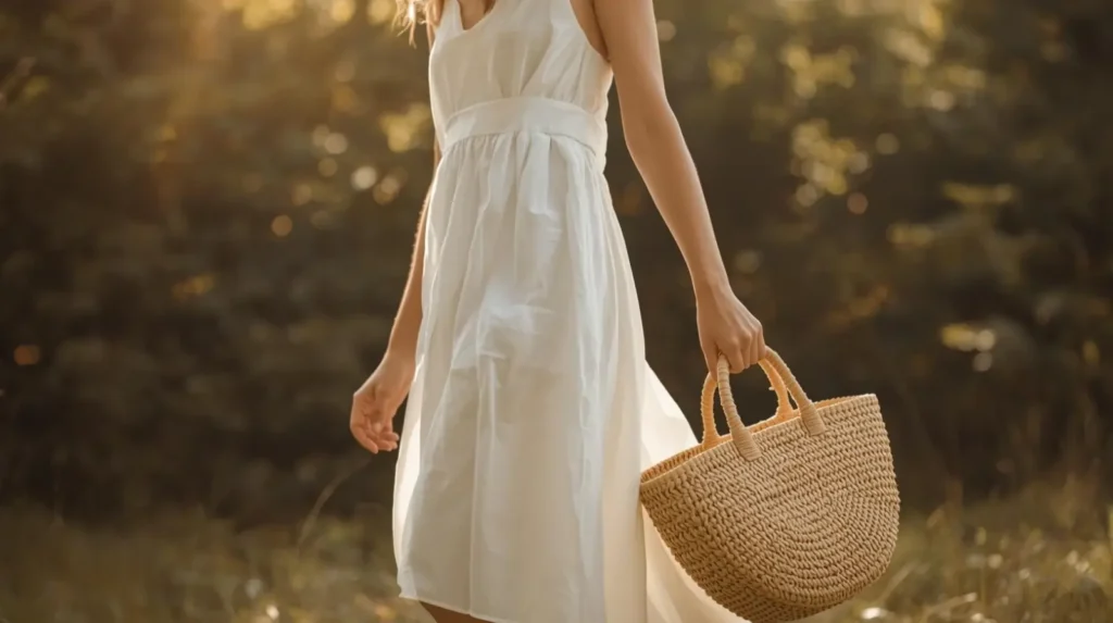 Light and airy; this dress is a stellar choice for a warm day! This pairs well with sandals and gold hoop earrings for a no-fuss, elegant Late Summer Outfits for 2025. Light, airy, and perfect for hot weather. This timeless piece truly belongs in our 21 Late Summer Outfits for 2025 – Simple and Stylish Looks list. Pair it with sandals and gold hoop earrings for an effortless classy vibe.